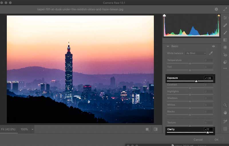 This city view, taken at dawn, shows a dense smog pollution that’s making it difficult to see the buildings clearly. You can download this image for free here. Choose Filter > Camera Raw.