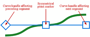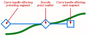 Each smooth and symmetrical point features two curve handles. One handle controls the shape of the preceding segment, while the other controls the shape of the segment to follow. Curved segment endpoints-the points at the beginning and ends of each path-contain only one curve handle each to control the respective segment.