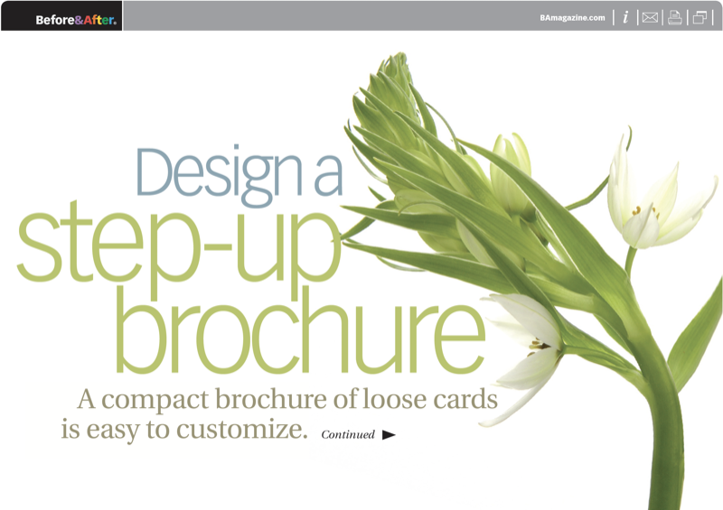 The step-up brochure is a jacket with three (or more) information cards stacked inside and a business card on the pocket. It fits a standard, #10 envelope. Its popularity is in its versatility; you can mix and match cards without reprinting the cover. This 16-page article from issue 42 of Before&After Magazine teaches you to create and customize a compact brochure of loose cards.