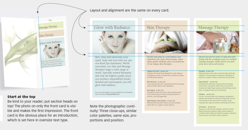 Lay out each card alike. Work down from the top—head, then photo, then text then carry the sizes and dimensions to the other cards.Lay out each card alike. Work down from the top—head, then photo, then text— then carry the sizes and dimensions to the other cards.
