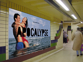 Imagine slowly gliding down the escalator at a London Tube station, then spotting a large ad with a smiling couple frolicking in the surf. At second glance you’re taken aback by the foreboding logo and the tagline "beauty and horror in contemporary art." This visual juxtaposition of ideas is a cerebral comment on what is and what will be.