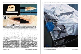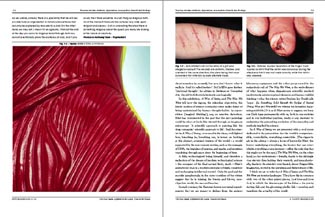 The medical aesthetic (if you will) is meticulously carried throughout the catalog. A glossy, sterile, white slipcase with hospital-blue lettering houses the exhibit catalog, which is blood red and bears a gold-embossed diagram of “changes after death.” The content of the catalog is almost entirely taken from medical publications as well. Jason Beard, who designed the catalog, says searching for relevant and parallel content for book was laborious because of Hirst’s reputation. Only the Journal of Clinical Forensic Medicine gave them permission to use the text from such articles as “Eight Cases of Suicide by Self-cutting or Self-stabbing” and “The Epidemiology of Violence.” Hirst’s art is subtly interspersed with gory close-ups of real-life wounds. Mimicking the visual language of medical books echoes the theme of Hirst’s new work: the exploration of life, body, and death.
