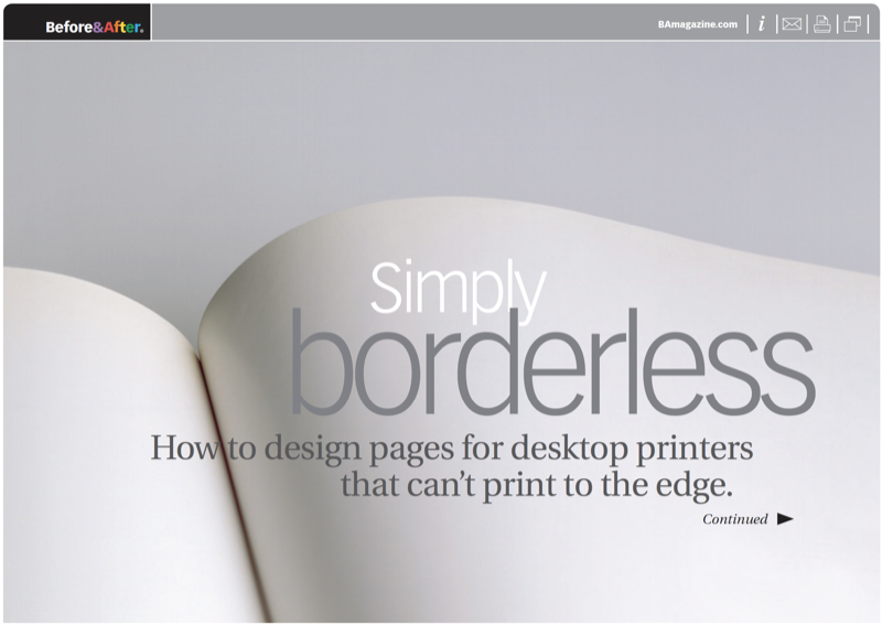 Modern desktop printers are small technical wonders, but many can’t print to the edges of the sheet (a full bleed). They leave a distracting white border that is undesigned and undesignable. So instead of fighting it, amplify the white space, and make it part of your designs. This 18-page article from issue 40 of Before&After Magazine teaches you how to design around the distracting white border that many inexpensive printers leave around the edges of your page .
