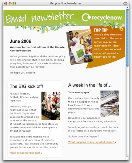 Figure 1. The Campaign Monitor site includes samples of e-mail templates that have been designed by others and processed by Campaign Monitor. Here, you see examples of newsletters from UK-based Recycle Now (top) and New Zealand youth culture magazine Soul Purpose (bottom).
