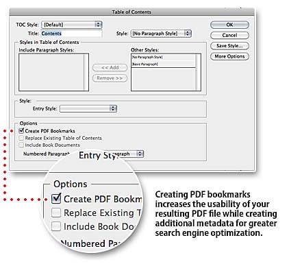 In the bottom left, notice a checkbox allowing you to Create PDF Bookmarks. After you finish assigning your styles for inclusion, click OK, and InDesign will create a text-loaded cursor with the text that appears in each applied style and the corresponding page number. When exporting your document, InDesign will create PDF bookmarks in the document in addition to creating a hyperlink of each TOC item to its corresponding page.