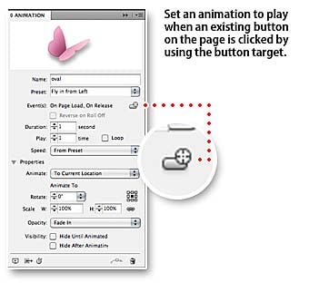 Animations can also be triggered by buttons, which gives you the opportunity to create remote interactive elements, such as animating one object with the same button that is changing a multi-state objects state at the same time. With an animated object selected, click the Create Button Trigger button in the Animation panel, then click on any object in your spread.