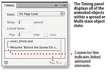 When more than one item is animated on a page, or spread, the Timing panel gives you the ability to control the order in which the animated objects play. Each animated item is listed in the panel, and you have the ability to drag the items up and down the list to control the order in which they play. If you select multiple items and click the link icon in the lower-right corner of the Timing panel, those objects will begin animating at the same time (see Figure 5). There is also a delay feature, which can be assigned to each object, and allows you have multiple animations playing at the same time, but with different start times.