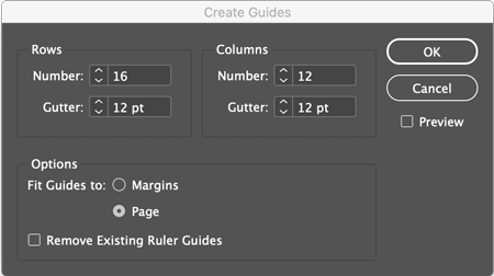 A layout grid will help you to organize the information. The number of grid subdivisions you use is partly a matter of personal preference. For the example, I opted for 12 columns and 16 rows—a combination that provides much flexibility, but also comes with the potential visual confusion of having many grid lines (Figure 3). At its core, this is a 3-column layout, with the larger items occupying 2 columns and the smaller items a single column. A 12-column arrangement is divisible by 2, 3, 4, and 6, making it malleable to your needs and also suggesting layout opportunities.