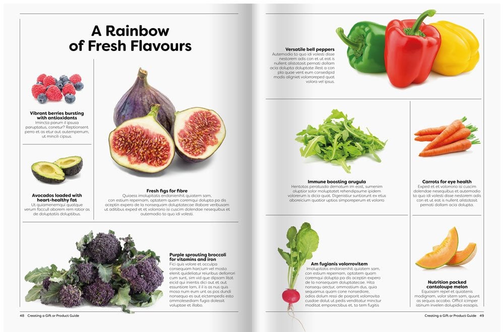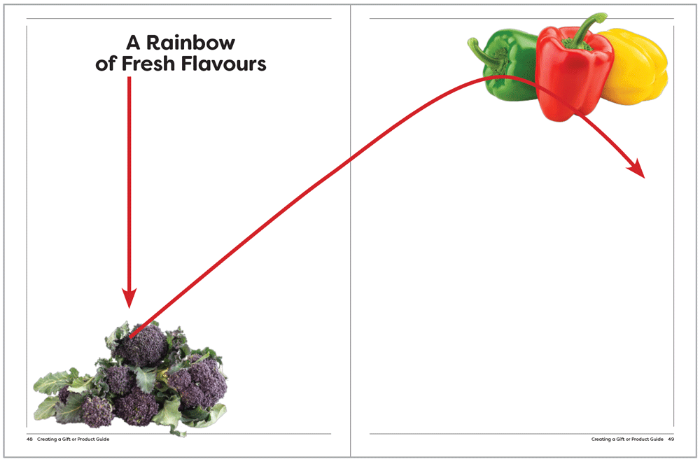 Design is largely about leading the reader’s eye to where you, the designer, want to take it. Images often have a sense of direction: where it looks like they’re pointing. With faces, this is easy, but with vegetables, it’s more subtle. The images should face in—towards the spine—rather out to the edge of the page. Notice the green pepper stem and larger crown of broccoli point inward. This makes them sit comfortably within the composition rather than looking like they’re trying to escape the page. The spread is balanced with a large image at bottom left and a correspondingly large image at top right, leading the reader’s eye diagonally up and around the spread (Figure 4). To introduce an element of mischief, some images break out of the grid or even bleed off the edge of the page.