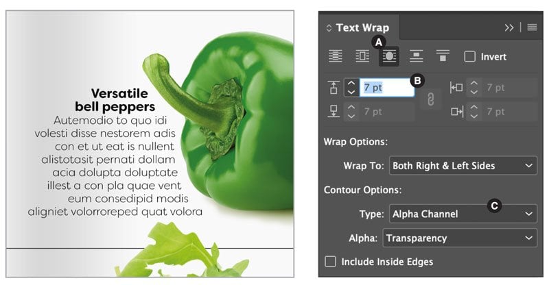 Figure 6. To allow text to wrap around a cut out image, select the picture frame and choose Wrap around Object Shape (A). Set the offset amount (B). From the Contour Options choose Alpha Channel (C) to use the shape of the layer mask added in Photoshop to create the wrap shape.