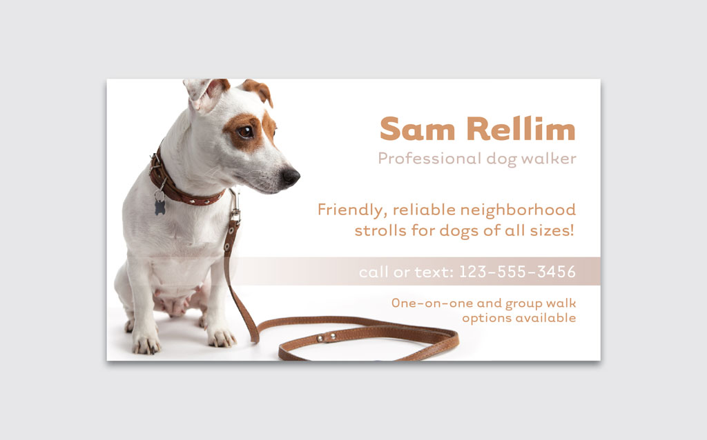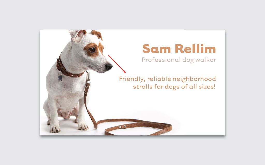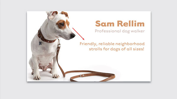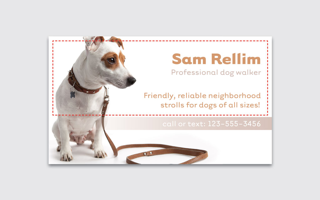 Next, we need to add the contact information in an eye-catching way, since the card is for busy pet owners who may not have the time or patience to search hard for this information. A colored band provides a smart setting for the number. A busy pet owner can now easily see the contact information, which is, in effect, highlighted.