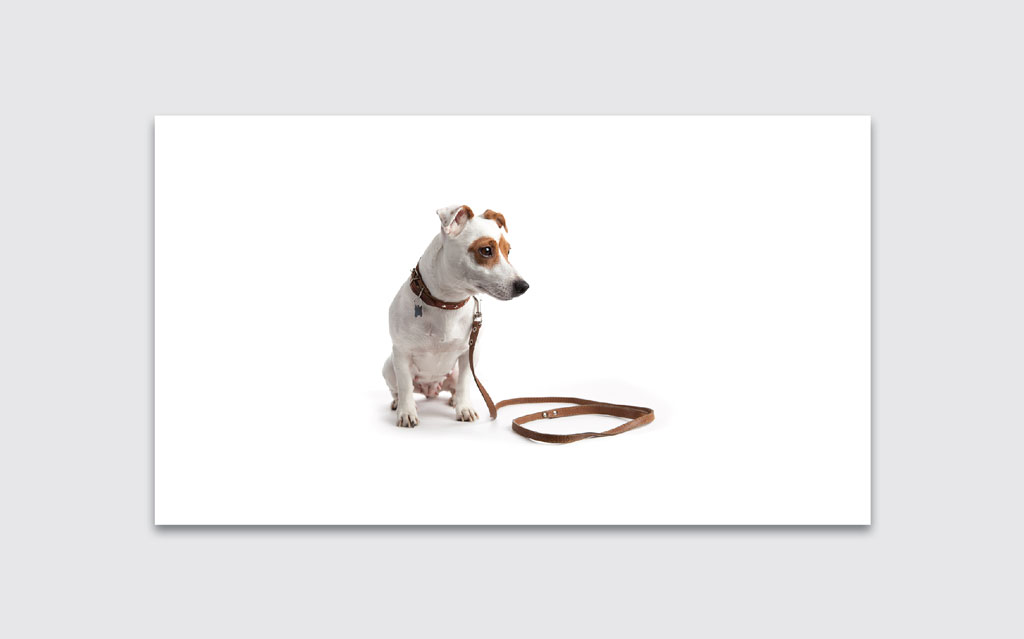 For this dog-walking business targeting busy pet owners, the goal is to convey a simple, fresh, airy, clean, and professional yet playful look. Start with an image that speaks to some or most of these goals. This dog on a white background hits the mark for most of these. So far, so good.