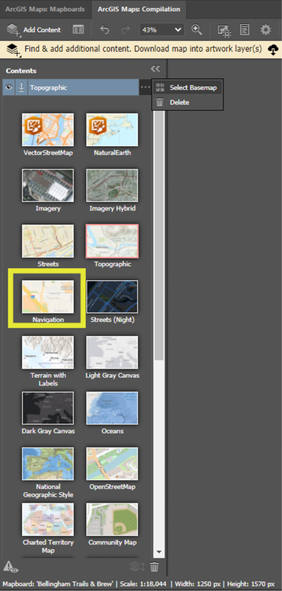 Figure 7. The Contents pane map gallery showing the Topographic vector tile basemap layer listed and the Navigation basemap highlighted