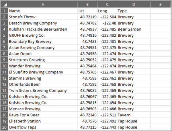 For the plug-in to parse the file accurately and mark a precise location, your file needs a spatial attribute. For my large-scale (zoomed-in) map, the brewery locations require high precision, so I used latitude and longitude coordinates for my spatial attributes. For a map with less precise requirements, such as one that shows all major airports in the country, spatial attributes could include a column for city and a column for state.