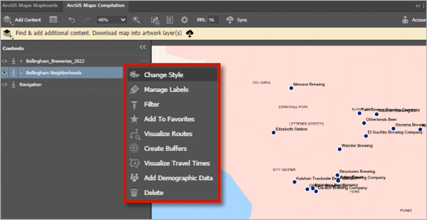 The Bellingham Trails & Brew map needed a single point for the precise location for each respective brewery. To add these, I added a custom point map layer CSV file (Figure 9). The most common way to add any map layer is from the Compilation panel. To do so, click Add Content, and select from the options:
