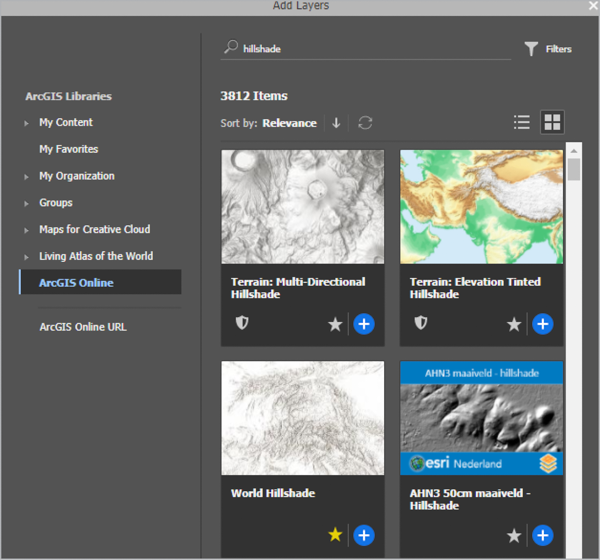 Figure 16. The Add Layers panel results after searching hillshade from the ArcGIS Online library