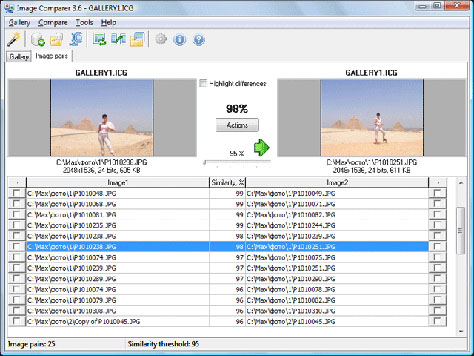 The entire process is automatic — the only thing required from the user is to specify the location of images and set the level of similarity adequate to personal needs. That’s it. All the rest is done automatically by the program. Searching having been finished, comparison starts, but it takes less time and results appear just several seconds later. Two display modes of image galleries are available – either in the form of thumbnails or table, as well as two display modes of results – in the form of table or a tree. Image Comparer groups pictures that look alike (taking into account similarity threshold being set). So, one can view them in pairs or work with top ten similar images and choose the best one! The program supports image file formats like RAW, JPEG, J2K, BMP, GIF, PNG, TIFF, TGA and others.