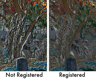 Set the blending mode of Layer 1 to Difference. This blending mode shows you what’s different between two images. If two images are out of register, you’ll see halos and color around objects, as shown in Figure 4. When they’re in register, you image should look like a grayed out version of the original. Select the Move tool and use the keyboard arrow keys to adjust the position of Layer 1, if necessary. If most of your image looks registered, it should be fine to continue.