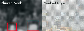 Direct modification. If you aren’t entirely happy with the results, you might want to look at the mask directly to see if anything can be modified. First, look to see how much of Layer 1 is contributing to the resulting image. To do this, simply turn off the Background and you’ll see the masked Layer 1 all by itself, like ours on the right in Figure 6. To do so, click on the Channels tab to switch to the Channels palette. Then, click in the empty box next to the Layer 1 mask to turn it on. Turn off all the other channels by clicking on the eye icon next to the RGB channel. Now, you can see your mask. It should look like ours on the left in Figure 6.