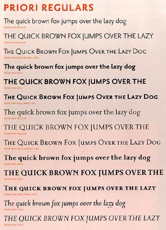 Emigre makes the point that Priori, like many of their other typefaces designed by graphic designers, is not for everyone. “In the end,” they admit, “these typefaces are not idiot-proof. They often require a trained, discriminating eye to use them effectively.” That’s true of any typeface, really, though a quirky typeface is harder to use well—and appropriately—than a more ordinary-looking face. “This results in typefaces that are perhaps limited in their application, but high on emotion and expressiveness when used well.”