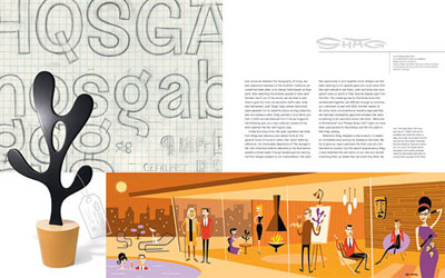 Since then, House has made its mark through promotion and packaging not only for design clients but, more importantly, for itself. The 10th-anniversary book is a sort of culmination of this progress. Many of the best House Industries designs, both typefaces and presentation, are shown here in vivid color, and the book itself is a polished example, featuring overprinted finishes and washes and metallic inks; according to Rich Roat, they were on the press check in Berlin for two weeks as the book was being printed. Some of the pages actually glow as you flip through them, if the light is right. (This is not always a good thing. There are a few places—but not many—where the silver ink overprints on bits of the text, which makes it hard to read.)