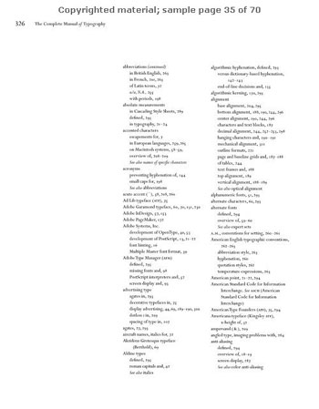 Reading this book is like sitting down with a long-time typesetter and going over the details of a complex job, pausing to ruminate on underlying principles and everyday rules of thumb, with occasional digressions to examine a fine point to the participants’ mutual satisfaction. Most people will use it as a reference—which it is—but reading any section straight through is rewarding. The writing is clear and straightforward, and Felici has obviously thought long and hard about everything he deals with here.
