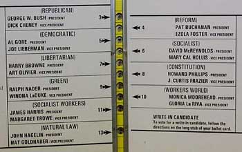 The designer of this particular ballot was trying to fit a long list of presidential candidates onto a single page (or rather, a single spread) of a fairly short ballot. Her solution was to put some of the candidates on the left-hand page, and others on the facing right-hand page, with the holes to be punched running in a line down the middle. What evidently flummoxed a lot of voters was that to vote for the second candidate on the left-hand page, Al Gore, you had to punch the third hole; the second hole was meant for the first candidate on the right-hand page, Pat Buchanan.