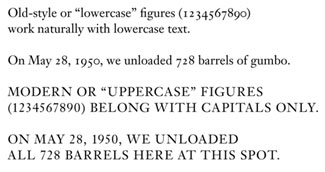 For many years, the “Adobe standard” character arrangement (which is by no means limited to Adobe) has put uppercase figures into every font, even old-style text faces that had never had uppercase figures in the first place. (The ultimate absurdity is Monotype’s addition of uppercase figures to Centaur, which mars an otherwise beautiful old-style typeface.) It’s still terribly common to see running text set with these cap-height figures, when the typeface family has perfectly good old-style, lowercase figures but they’re in an Expert Set that the typographer hasn’t bothered to use. Since lowercase figures fit in comfortably with lowercase letters, it makes sense to use this kind of figure for dates and other numbers that appear in the middle of running text. If you use uppercase figures instead, the numbers all stick out like so many sore thumbs. We’re used to seeing this, but it’s ugly.