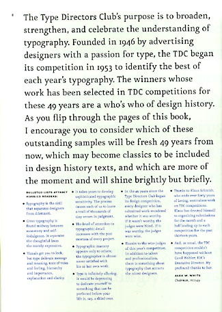The chairman of the typography competition was Alex W. White, and the chairman of the type-design competition was James Montalbano. Both of them wrote chairman’s statements (see Figure 4). These are always a chore to write, and too often they fall into a litany of truisms. Alex White gets at the heart of the matter when he says: “As you flip through the pages of this book, I encourage you to consider which of these outstanding samples will be fresh 49 years from now, which may become classics to be included in design history texts, and which are more of the moment and will shine brightly but briefly.” We all have opinions about this, but we can’t be sure until some time has passed. (A collection of TDC annuals is an excellent resource for looking back to see what lasted and what didn’t.)