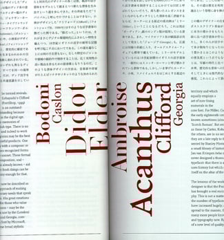 The integration of image and text is admirable throughout Idea. The text is presented bilingually, in Japanese and English, and the text typography is consistently readable, despite occasional layout excess that makes it momentarily hard to follow from one column to the next. (I don’t read Japanese, so it’s the typography of the English text that I’m talking about here—though as far as I can tell the Japanese text also looks clean and easy to read.) The only real fault is in the text itself, which could have used more careful editing. The introductory article by Robin Kinross, self-effacingly titled “Some features of the font explosion,” is well written, but some of the text by those who are not native English-speakers would have benefited from a sharper editorial eye.
