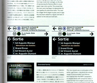 In some ways, the most fascinating part of the Porchez section is a study of the Métro type (commercially released as Parisine) that Jean-François designed for signage in the Paris Métro. In designing typefaces for such high-profile uses as the capital’s transit system and the text of the nation’s most respected daily newspaper, he was made very much aware that “typefaces are not simple products; they are cultural items.” In creating specimens (many shown here), he envelopes the letterforms with a cultural context, not just dry examples; and in designing typefaces for public use, he builds their context into the form of the design.