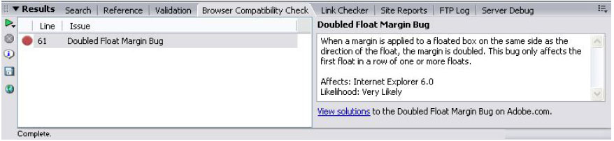 To actively participate in the site, you’ll need a free Adobe or Macromedia ID, but lurking is simple — once you see the Browser Compatibility Check’s error panel, click the View Solutions link at the bottom and you’ll bring up the CSS Advisor site with the solution to your problem.