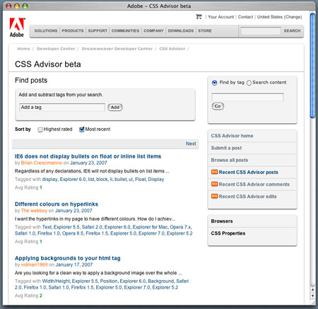 Adobe initiated the CSS Advisor Web site and populated it with some information on CSS and issue workarounds. However, you, me, and other Web workers are expected to keep the site current by adding issues and workarounds we know about (Figure 2). You can also comment on other posts.