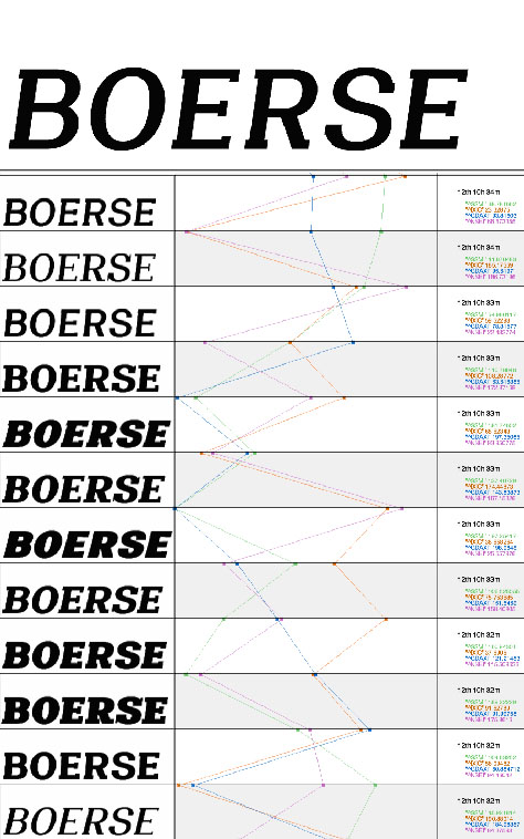 In considering type we speak, for example, in terms of bold, thin, grotesque, classical, roman, italic: terms that all describe a defined variant of the font family. Thus we only ever see individual fixed points in what is actually an infinitely wide space of possibilities.