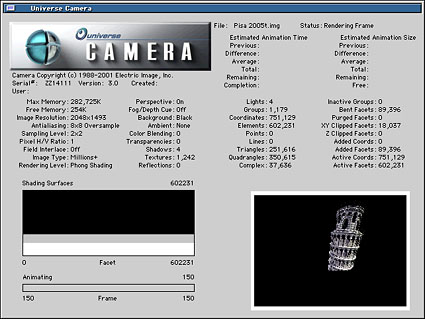 The fact that Camera is a separate application from the Animator allows the Animation module to quit during rendering, thus freeing up more memory for the job. And with Universe, more memory equates to more speed. On the Mac with OS 9.1 this strategy didn’t work reliably during testing, however; sometimes Camera was able to get a full allotment of RAM, but other times it failed to recognize that Animator had quit, and it launched with only the memory remaining after Animator’s allocation; sometimes Universe quit but failed to launch Camera. How much memory you’ll need in your system depends on the complexity of your scenes, but I would suggest having at least 500MB of RAM, and more if you plan to use other applications concurrently. It also possible that all will work better under OS X; OS X support had not yet been released as we conducted our testing.