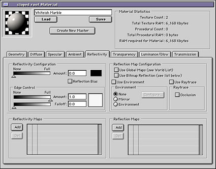This texture-mapping dialog controls an individual object’s rendering parameters, including whether or not it should be included in ray-tracing calculations for accurate reflections and transparency. Selective ray tracing allows Electric Image to forgo expensive calculations for the sake of speed.
