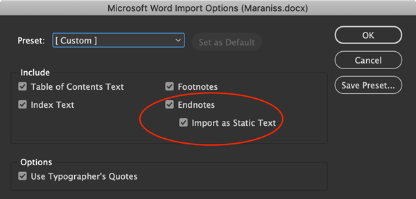Unfortunately, there are a couple of bugs with this option as well. First, if your endnote markers are properly styled throughout your text in Word with a superscript character style, the conversion to static text will remove that styling. This conversion process will also place an extra paragraph return at the end of each endnote that it converts to static text. Therefore, if you use this new option, be aware that some cleanup and restyling will be required that wasn’t necessary before CC 2019.