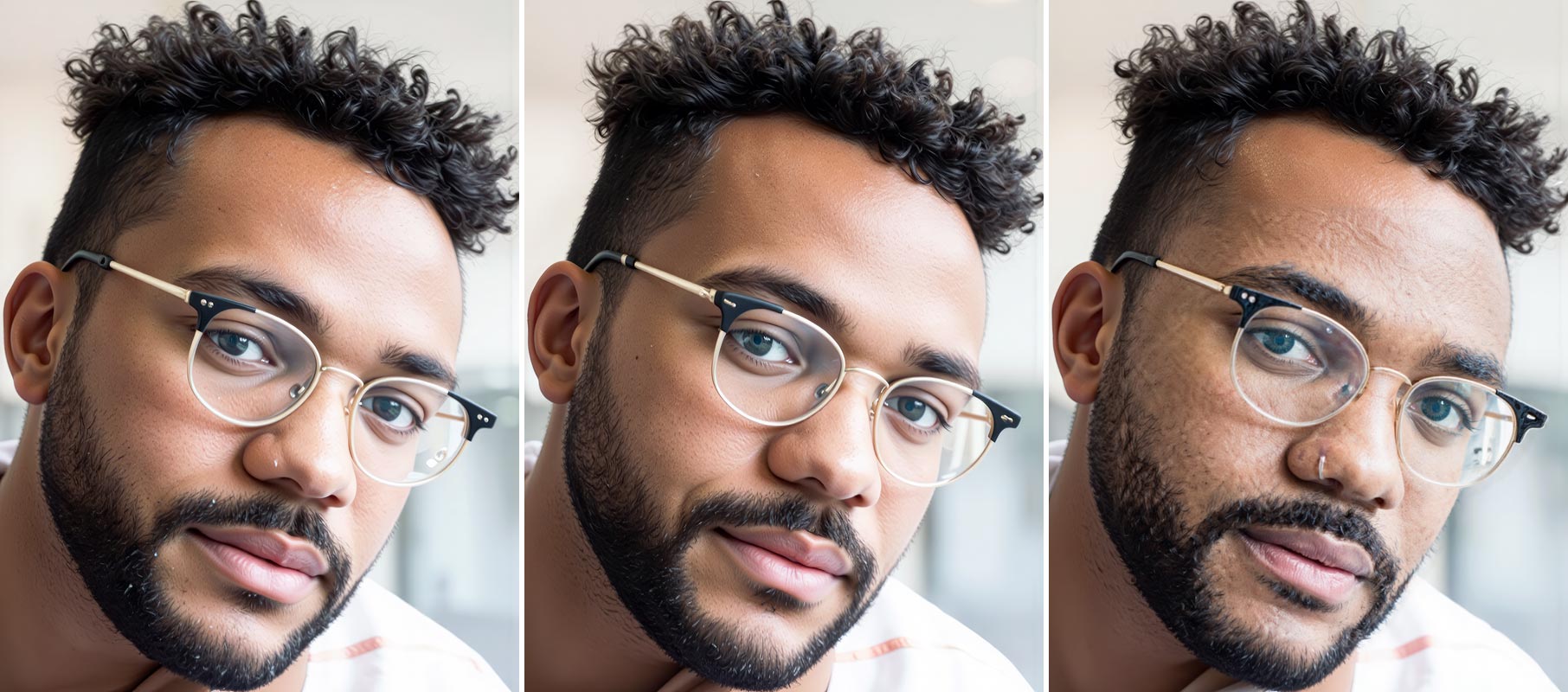 Left is the tool set to 0, which equates to minimal imagination. It’s still very sharp, although the skin is unnaturally smooth. Center is the tool set to 5, which is very similar. But note how the nose ring, which you can just make out on the original, has entirely disappeared. On the right is the tool set to the maximum value of 10, and this time it has not only included the nose ring, but brought texture into the face in an attempt to it look more realistic.