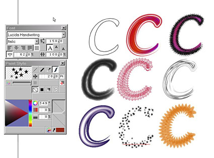 The new bitmap tools are welcome additions, but don’t expect an embarrassment of riches here: There are two basic brushes — soft round and pixel (basically a pencil) — plus an eraser. The Paint Style palette provides adjustments for hardness, spacing, opacity, and size plus a Draw on Mask button for protecting parts of the bitmap from editing. There’s a really cool built-in tracing function for converting bitmaps to vector paths and a warp feature for distorting the bitmap (the warp feature can also be applied to vectors). The program supports Photoshop plug-ins, too. I found these features most useful for creating interesting strokes, although the inclusion of plug-in support and adjustments for coloration, brightness, contrast, hue, saturation, and lightness is convenient for on-the-fly image adjustment.