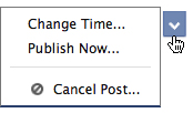 Mouse over to the right-hand side of a scheduled post in the Activity Log, and you should see a downward pointing arrow appear. Click that, and from the menu you can choose to change the time of the posting, publish it immediately, or cancel it altogether. (Unfortunately, you can’t edit the text of the posting itself in the Activity Log. If you need to do that, you’ll have to cancel it, and then set it up again correctly from scratch. Editing posts is at the top of my Facebook feature wish list these days!)