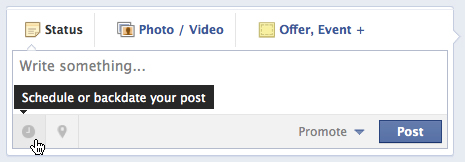 Once you’ve made sure you’re posting in the page’s voice, head down to the publishing area to set up your post. Once you click in the “Write something … “ field, you should see a little button with a clock icon on it appear in the lower-left corner.