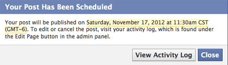 Figure 7: Success! Facebook lets you know that your upcoming post has been scheduled.