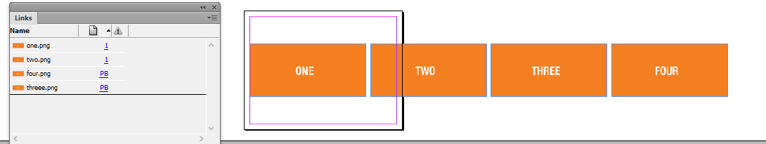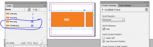 I created an article for DPS project that contained a scrolling frame that would be used as a custom navigation. I created thumbnails of all the pages, laid them out, grouped them and then pasted them into the frame that would be converted to a scrolling frame using the overlay creator. This worked great but when I packaged the file, the graphics that were located outside the bounds of the page were not packaged and so the client was left with missing links. As you can see in the following screenshots, even after being grouped and pasted into a frame, two of the graphics are still showing as being on the pasteboard.