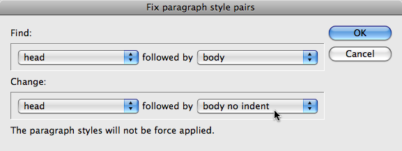 That’s why I jumped when I saw a new script by Thomas Silkjær that lets you find/change the paragraph styles for “this paragraph and the one following it.” Unfortunately, because it’s an AppleScript, it will only work on a Mac. However, perhaps he’ll release a VB or JSX version at some point. Or perhaps other scripters will even improve on his idea.