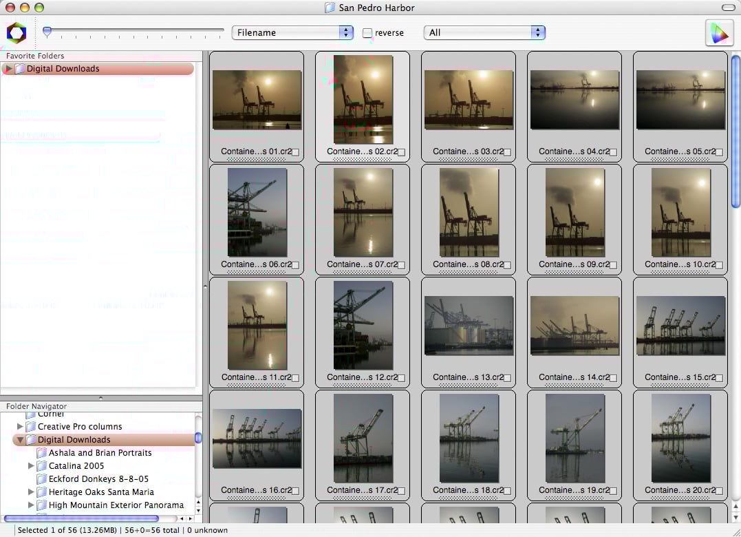 Once you’ve renamed images, you can reorganize them into folders of similar subjects using Bridge or your operating system. On a recent journey, I shot photos of dolphins, container cargo cranes, fishermen, an aircraft carrier, and a number of personal photos. After I renamed them, I sorted them into appropriately labeled folders.