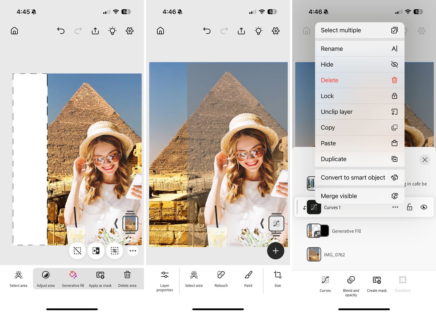 But there’s a problem here: the Curves adjustment used the pyramid layer as a clipping mask, and now it’s clipped to the generated layer instead. Happily, this is easily fixed: opening the Layers list and tapping on the three dots next to the layer allows you to perform a range of functions. In this case, Unclipping the Adjustment layer allows it to apply to all layers beneath (right).