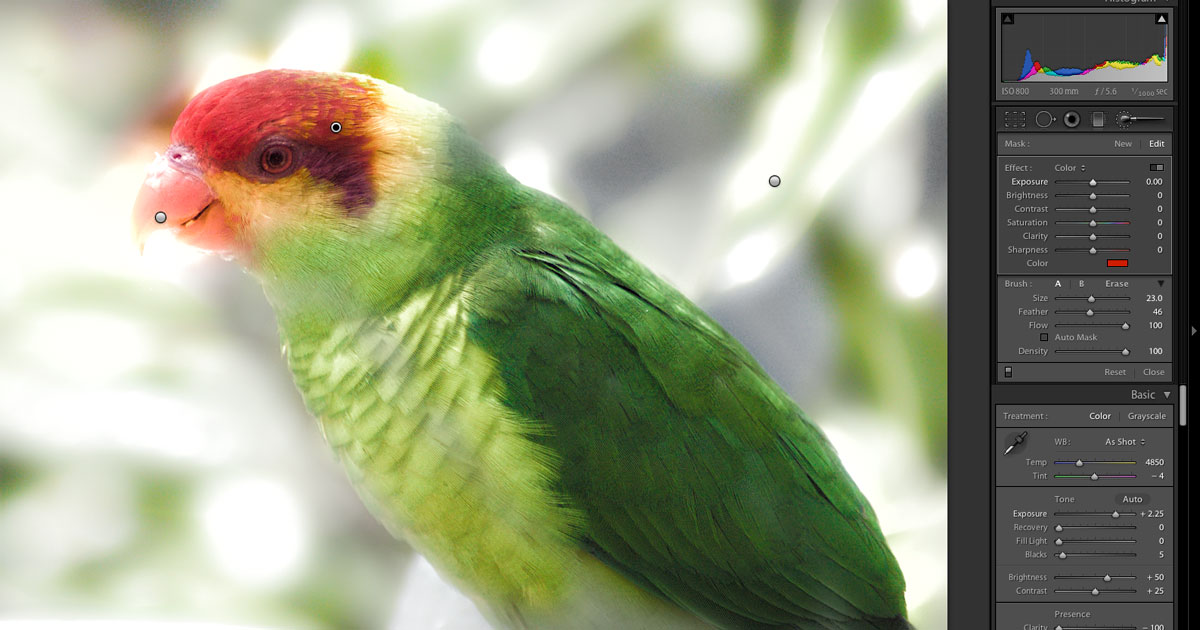 Figure 10. I added a third Adjustment Brush to add red color to the plumage. Click the image for a larger view.