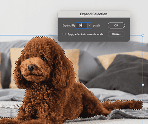 - Click Apply, then extend the selection a bit in the Expand Selection dialog box (Select > Modify > Expand). You can start with 20px, but use a higher number when your image is larger.