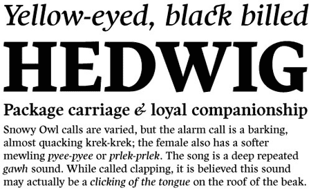 André Simard’s angular serif face is easy to read in long texts, advertising copy, annual reports and the like; but one that also provides a crisp and stylish appeal in more prominent display settings. The “Harfang” is a Snowy Owl, the official bird of Simard’s native Québec.