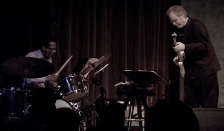 A couple of weeks ago, I photographed a concert given by the great jazz guitarist Bill Frisell. The concert venue — Yoshi’s in Oakland’s Jack London Square — is a good place to hear music and a good place to have sushi, but on this particular night it was a lousy place to take pictures. The band was a trio, with the bulk of the lighting focused on Frisell on one side of the stage and organist Sam Yahel on the other. Drummer Brian Blade was left largely in the dark.